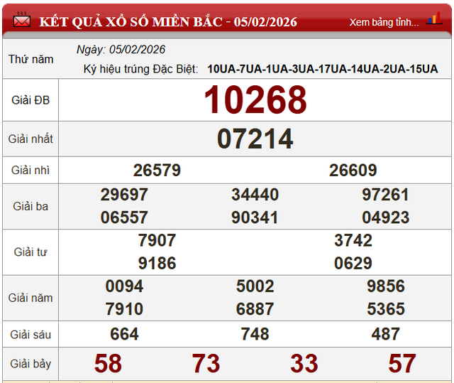 Cuối cùng, xổ số miền Bắc hôm nay thứ Năm ngày 5/2/2026 có kết quả như sau: