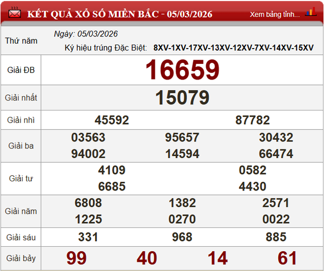 Cuối cùng, xổ số miền Bắc hôm nay thứ Năm ngày 5/3/2026 có kết quả như sau: