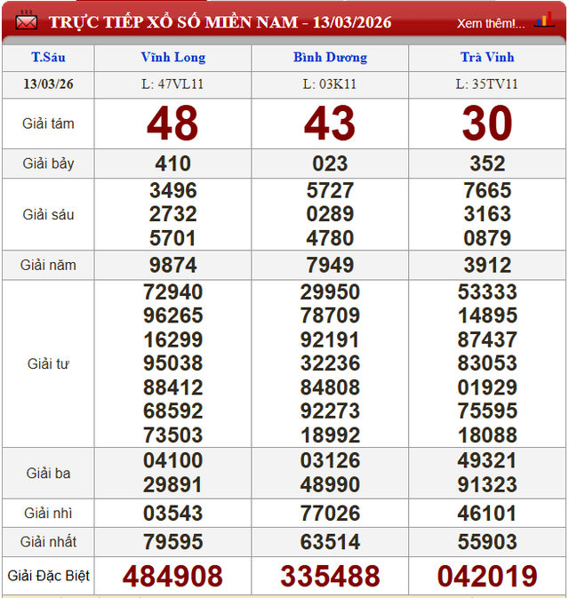 Kết quả xổ số miền Nam ngày 13/3/2026.