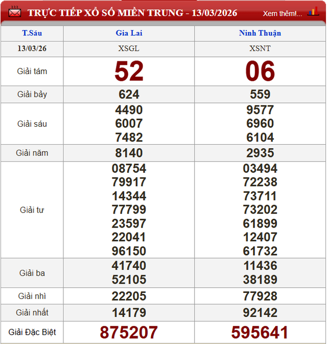 Kết quả xổ số miền Trung ngày 13/3/2026.