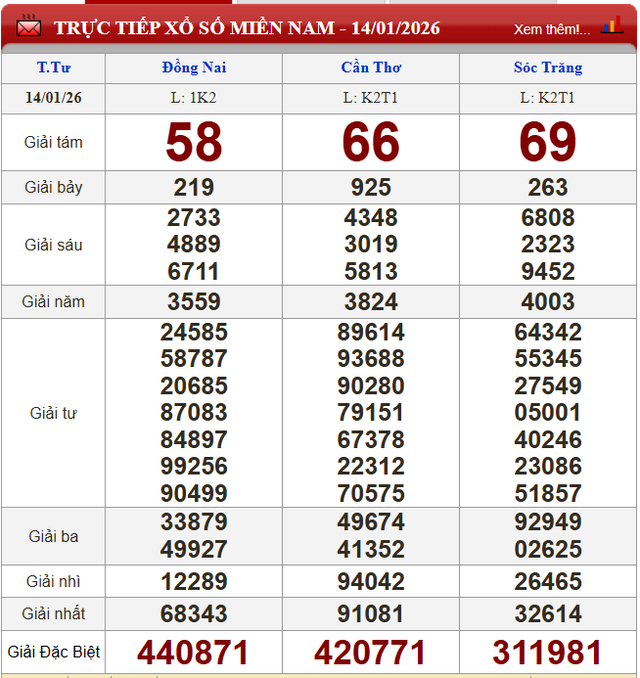 Kết quả xổ số miền Nam ngày 14/1/2026.