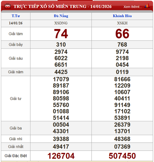 Kết quả xổ số miền Trung ngày 14/1/2026.