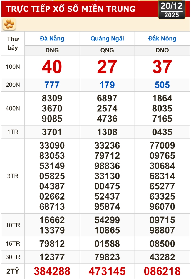 Kết quả xổ số của xổ số miền Trung (XSMT): Đà Nẵng, Quảng Ngãi, Đắk Nông