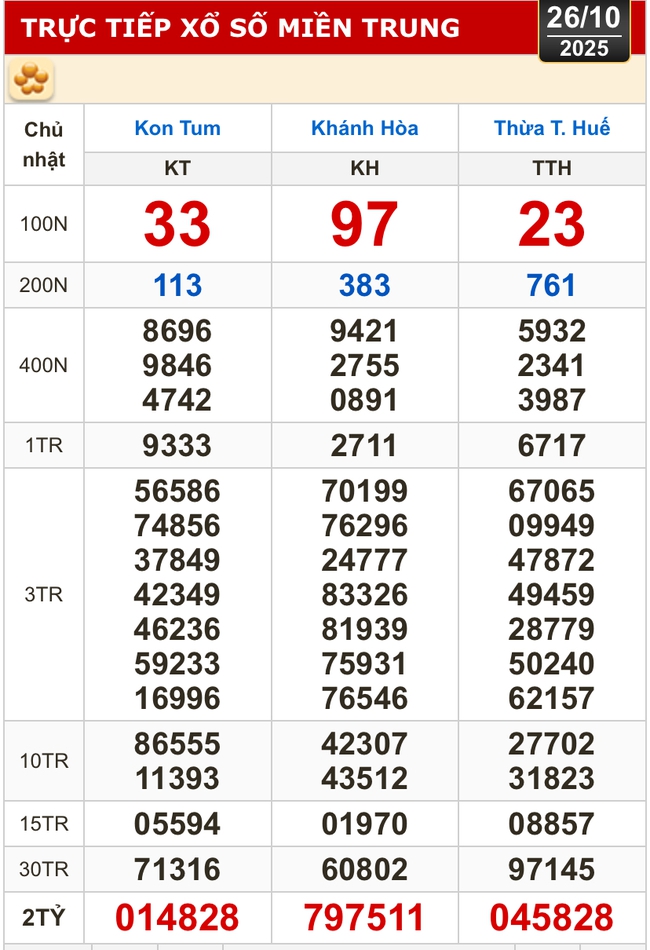 Kết quả xổ số hôm nay của xổ số miền Trung (XSMT): Khánh Hòa, Kon Tum, Huế