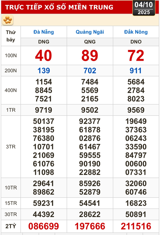 Kết quả xổ số của xổ số miền Trung (XSMT): Đà Nẵng, Quảng Ngãi, Đắk Nông
