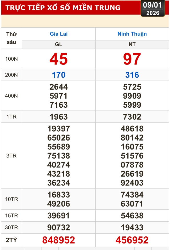 Kết quả xổ số hôm nay của xổ số miền Trung (XSMT): Gia Lai, Ninh Thuận