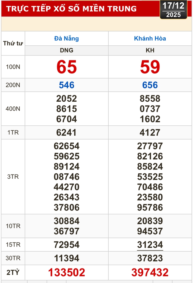 Kết quả xổ số hôm nay của xổ số miền Trung (XSMT): Đà Nẵng, Khánh Hòa