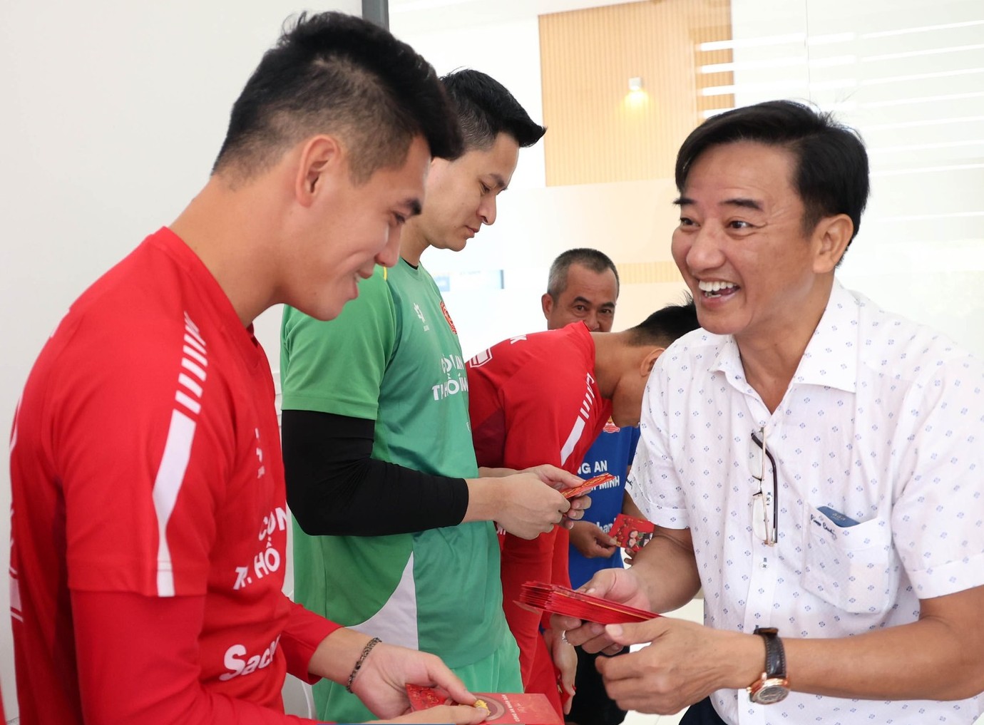 Tiền đạo Nguyễn Tiến Linh nhận phong bao lì xì lấy may mắn từ lãnh đạo CLB. ẢNH: ĐÌNH VIÊN