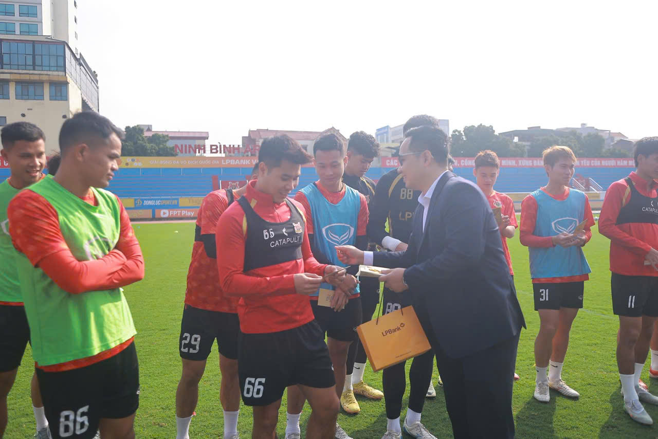 Ông Quang Việt, lãnh đạo đội bóng Ninh Bình, lì xì và chúc Tết các cầu thủ