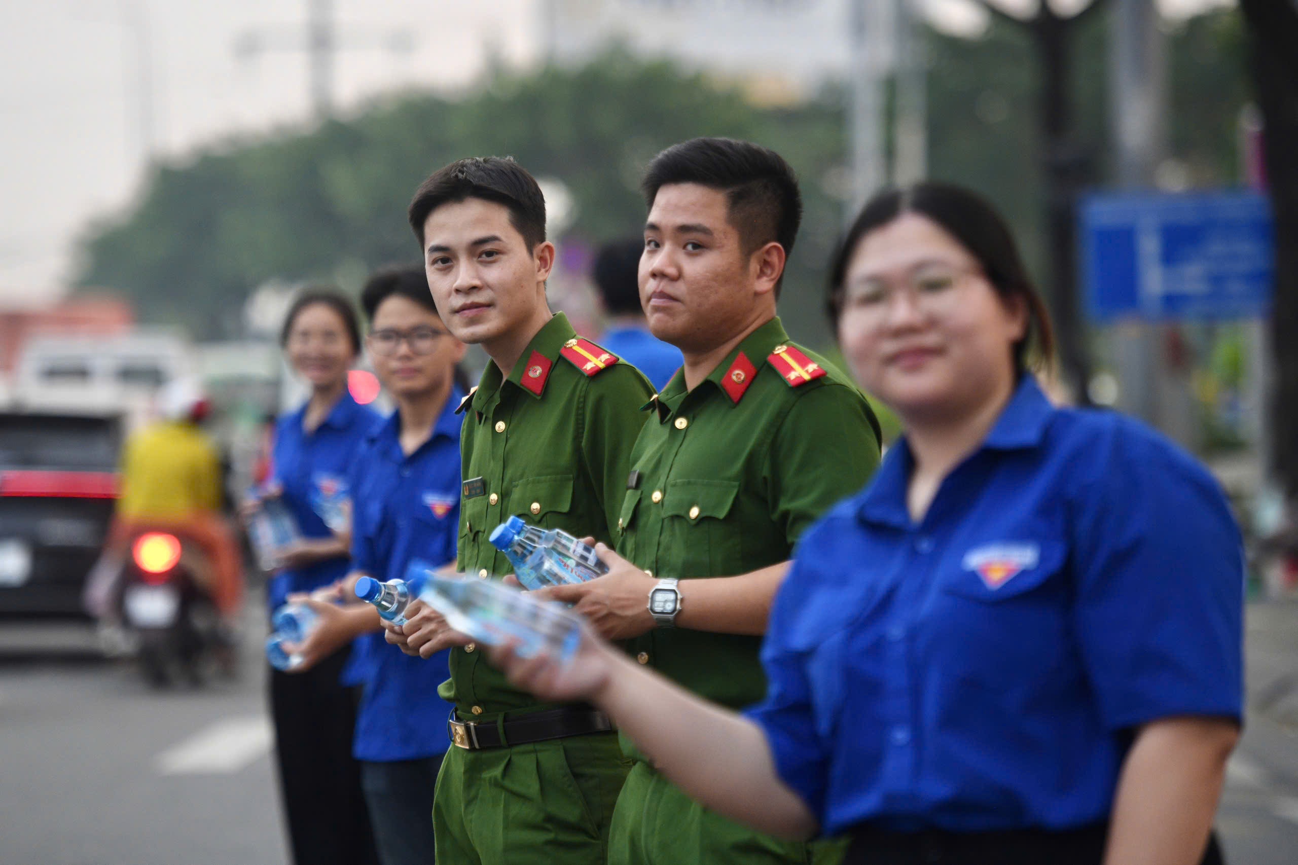 Công an và Đoàn thanh niên xã Tân Nhựt (huyện Bình Chánh cũ), TP.HCM phát nước cho người dân trên đường về quê.