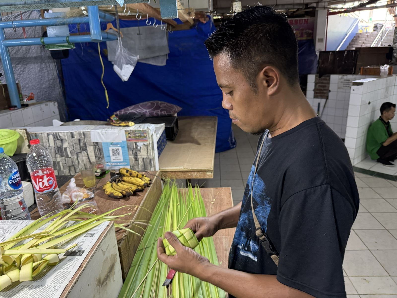 Anh Andri, người đan vỏ ketupat tại chợ Santa, Nam Jakarta. Ảnh: Đỗ Quyên/PV TTXVN tại Indonesia