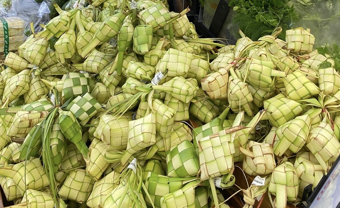 Ketupat là bánh gạo được nấu trong lớp vỏ lá dừa đan thành hình vuông hoặc hình thoi. Sau nhiều giờ luộc, hạt gạo nở đều, lấp đầy khung lá, tạo thành khối bánh chắc và dẻo. Trong mâm cơm Lebaran, ketupat thường được dùng kèm với các món đặc trưng như opor gà nấu nước cốt dừa, rendang bò đậm vị hay sambal goreng ati cay nồng. Sự kết hợp ấy đã trở thành hương vị quen thuộc và không thể thiếu trong bữa cơm của ngày đoàn tụ.