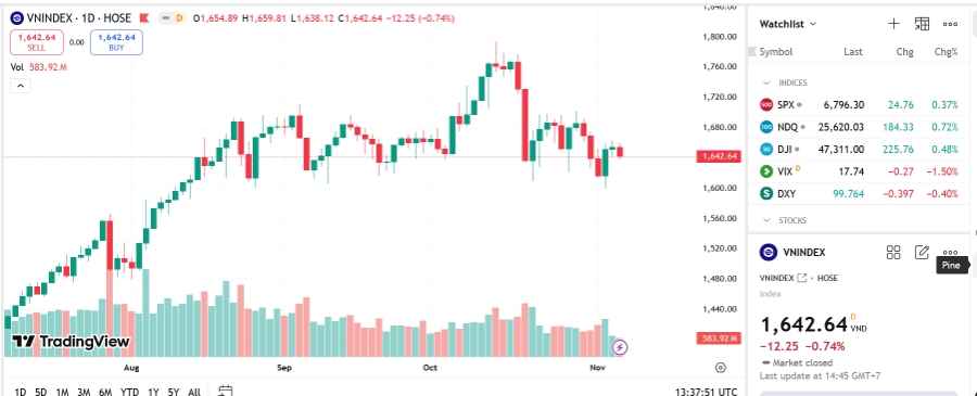 "Sau nhịp giảm hôm nay, chỉ số đang kiểm tra vùng hỗ trợ quanh 1.640. Nếu thanh khoản duy trì ở ngưỡng thấp này và VN-Index chưa vượt lại 1.680, khả năng thị trường còn giằng co – tích lũy lại. Nhà đầu tư có thể cân nhắc giữ tỷ trọng danh mục vừa phải, ưu tiên mã cơ bản tốt, có câu chuyện quý IV và đầu 2026; tránh đuổi giá tại các vùng kháng cự và quản trị rủi ro kỷ luật theo mốc hỗ trợ vừa nêu.