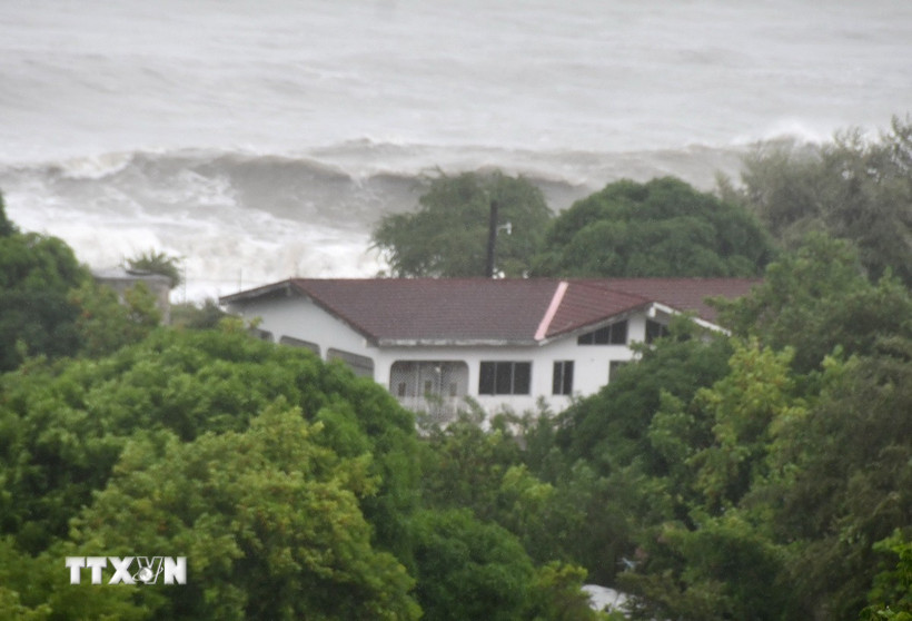 Sóng biển dâng cao khi bão Melissa đổ bộ vào St. Thomas, Jamaica ngày 28/10/2025. (Ảnh: THX/TTXVN)