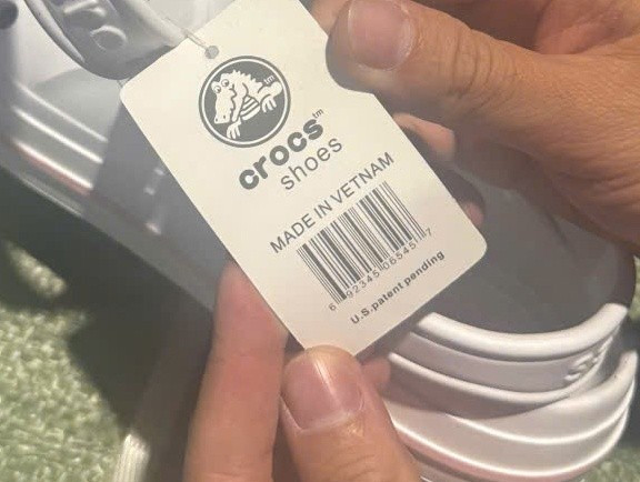 Ngày 13/5/2025, Hải quan cửa khẩu quốc tế Móng Cái kiểm tra thực tế 1 lô hàng quá cảnh đã phát hiện 5.000 sản phẩm có dấu hiệu giả nhãn hiệu, vi phạm xuất xứ và có dấu hiệu vi phạm sở hữu trí tuệ. Cụ thể là 3.200 đôi dép sục nhựa có găn nhãn hiệu Crocs trên nhãn hàng hóa thể hiện dòng chữ “Made in Viet Nam”; 1.720 áo thun dài tay có gắn nhãn hiệu Chanel, Dior và Loewe trên nhãn hàng hóa thể hiện dòng chữ “Made in Thailand.” (Ảnh: HQ/Vietnam+)