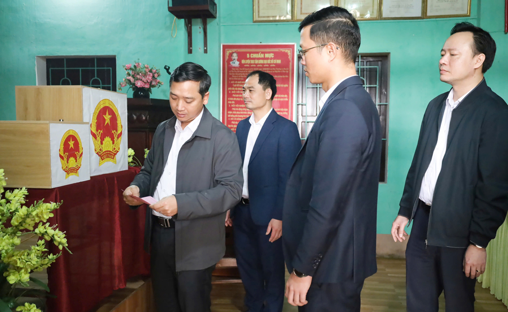 Đồng chí Nguyễn Việt Oanh, Phó Bí thư Tỉnh ủy, Chủ tịch HĐND tỉnh kiểm tra tại khu vực bỏ phiếu ở thôn Tiến Sơn, xã Phúc Hòa.