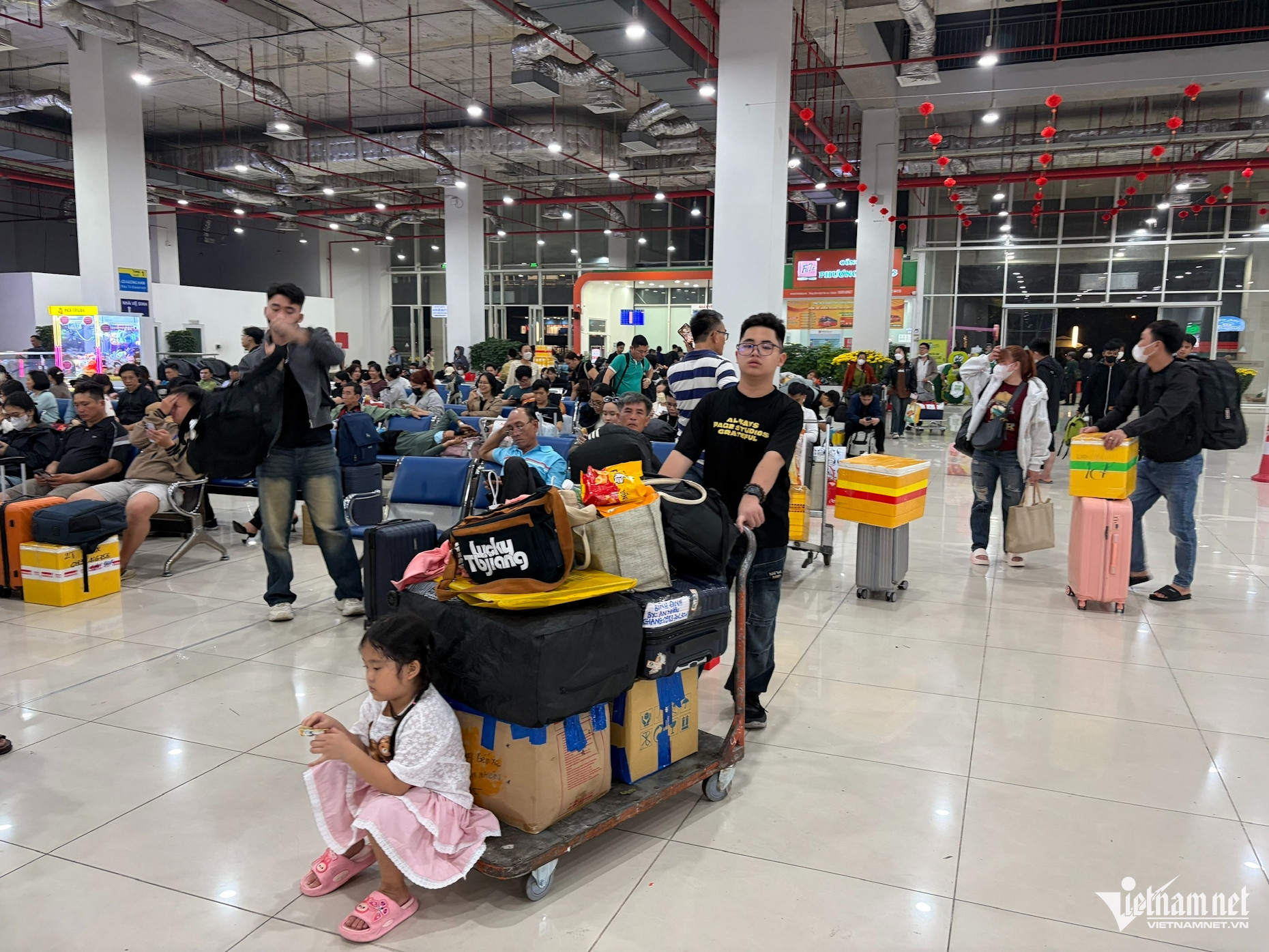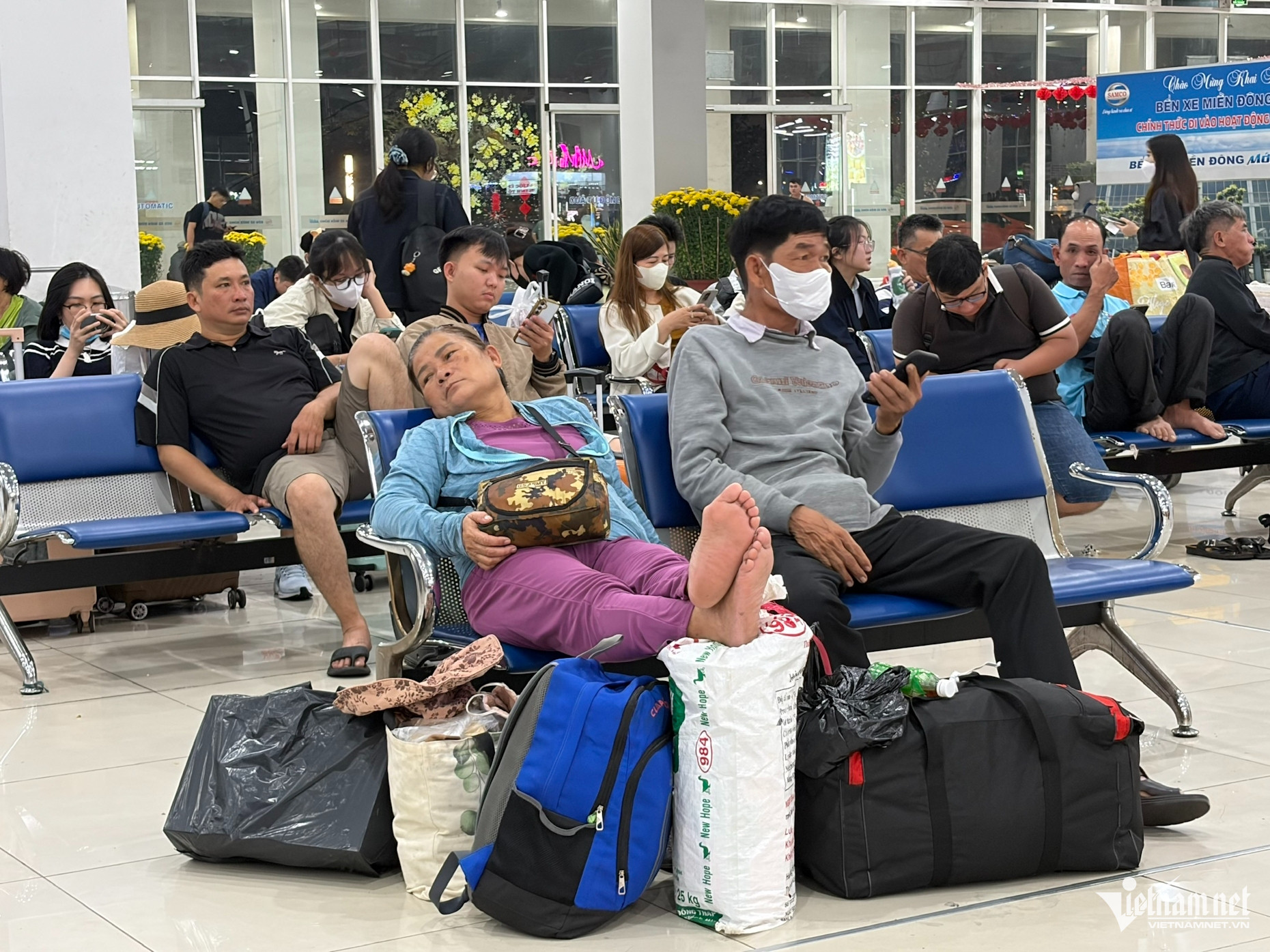 Theo ghi nhận của PV VietNamNet vào tối 12/2 (tức 25 tháng Chạp), tại sảnh chờ của Bến xe Miền Đông mới (phường Long Bình, TPHCM), hàng trăm hành khách mang theo lỉnh kỉnh vali, thùng quà Tết đã ngồi kín các dãy ghế.