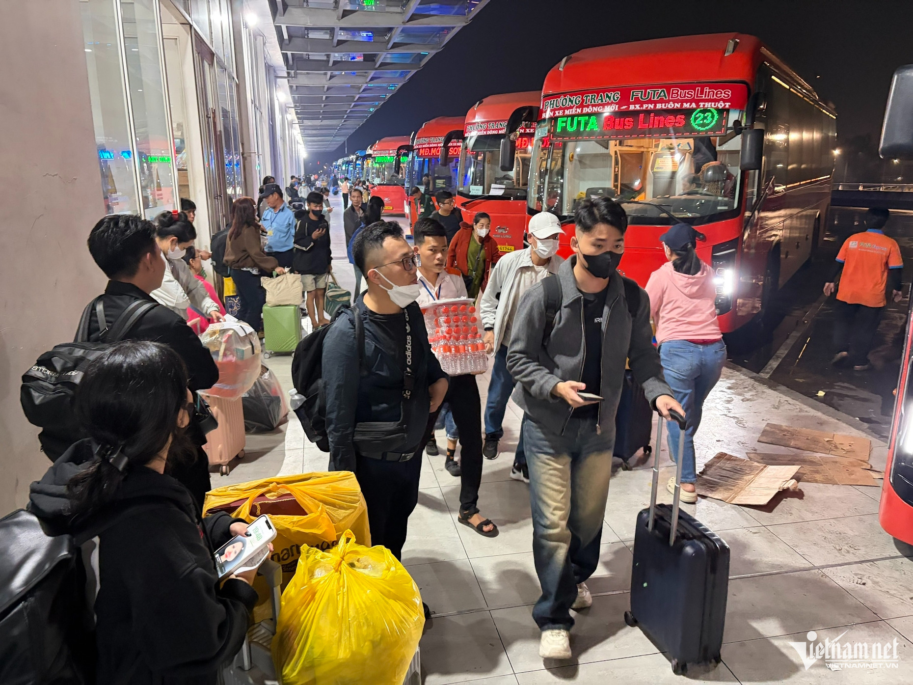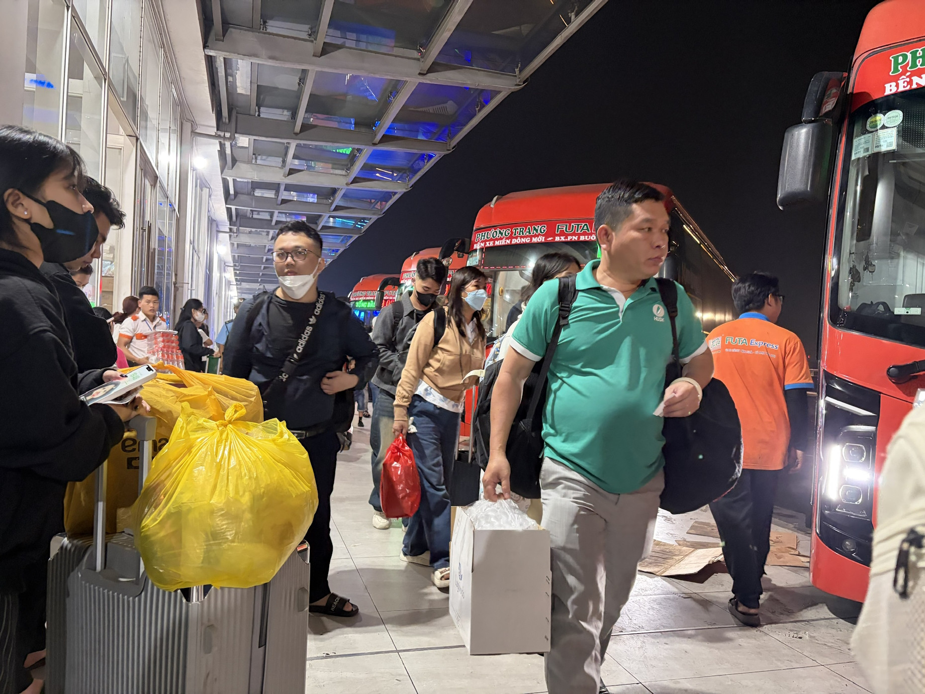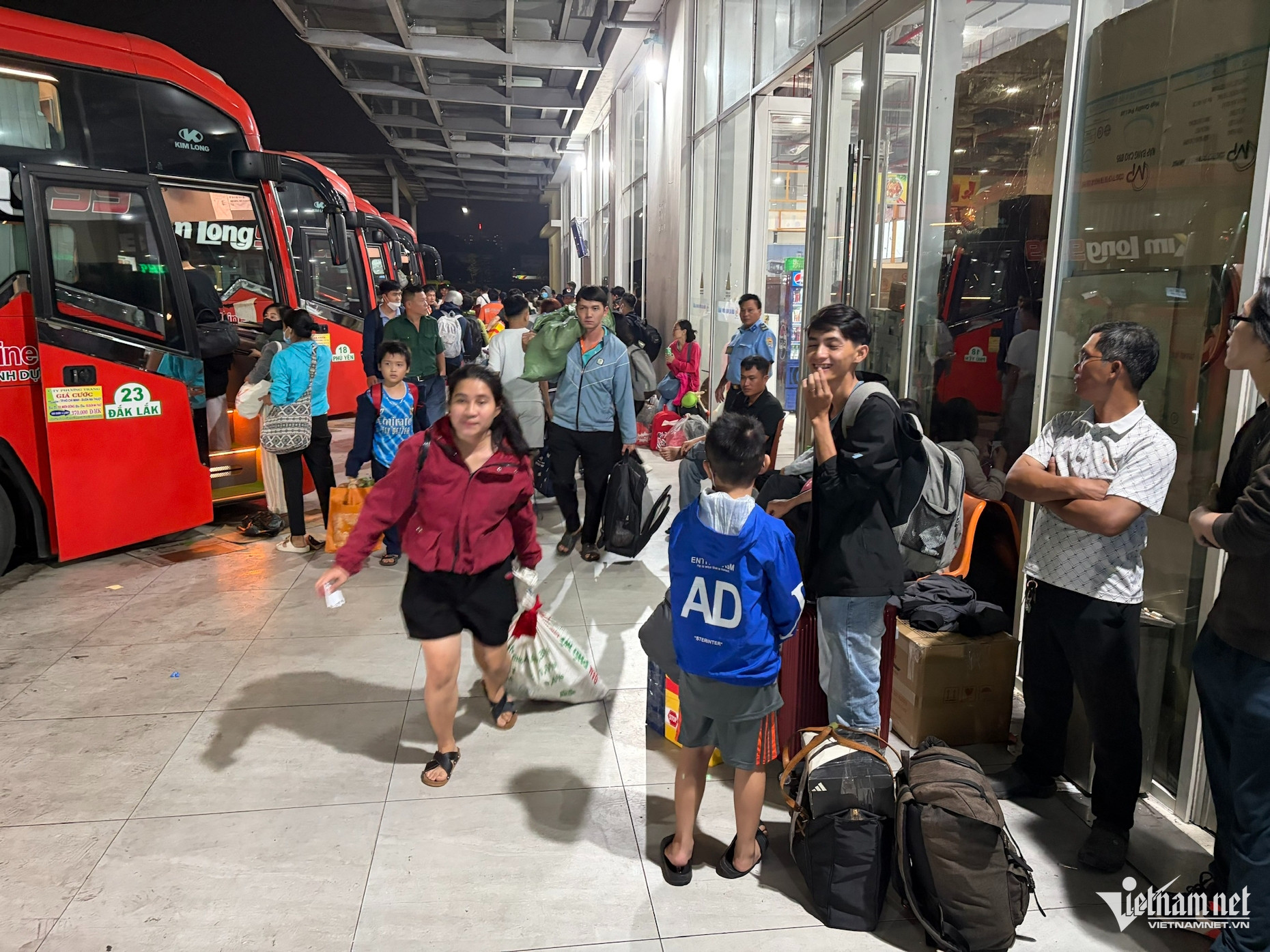 Càng về khuya lượng khách đổ về bến xe càng đông. Trong ảnh, người dân hối hả di chuyển ra cửa khởi hành theo tiếng loa thông báo liên tục của nhân viên điều phối.