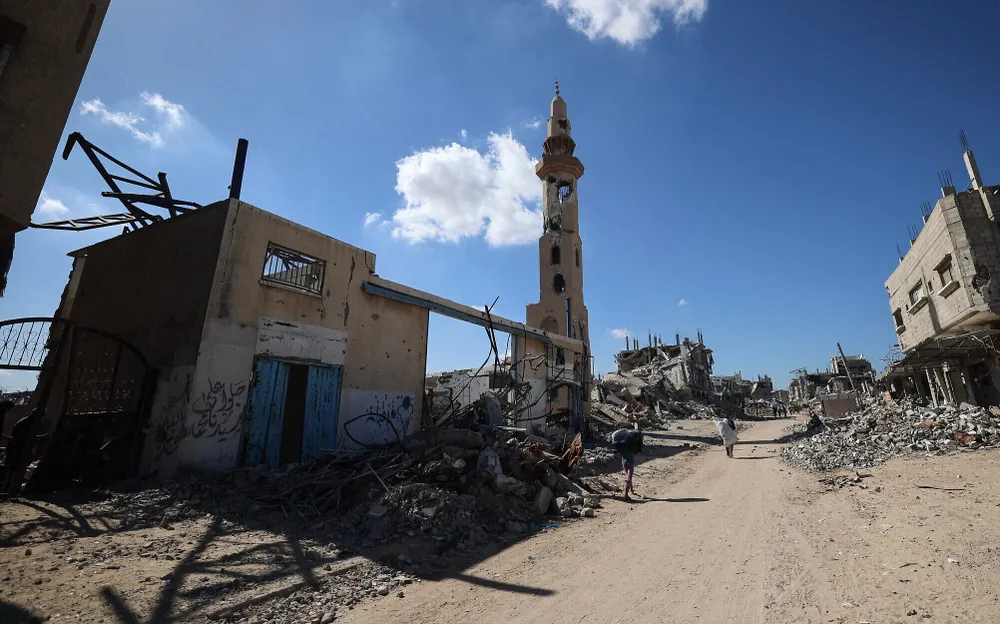 Người dân Gaza đi ngang qua những tòa nhà bị phá hủy ở khu vực al-Zahra, phía bắc trại tị nạn Nuseirat, miền trung Gaza vào tháng 10. Ảnh: Eyad Baba/AFP