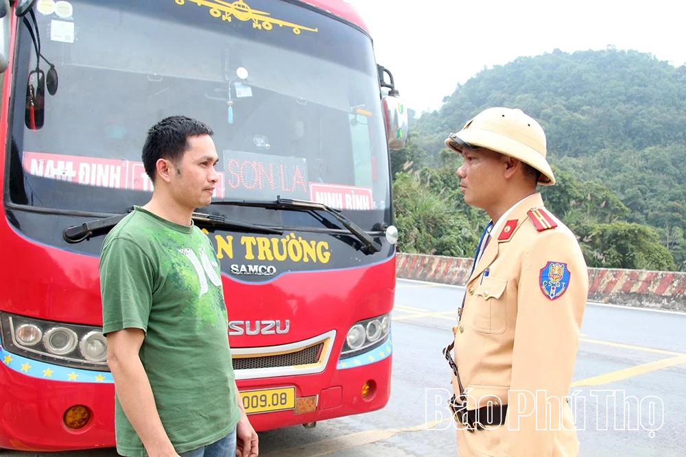 Thiếu tá Nguyễn Hữu Trường, cán bộ Trạm CSGT Tân Lạc nhắc nhở lái xe Nguyễn Văn Trường cẩn trọng khi lái xe qua khu vực đèo Thung Khe.