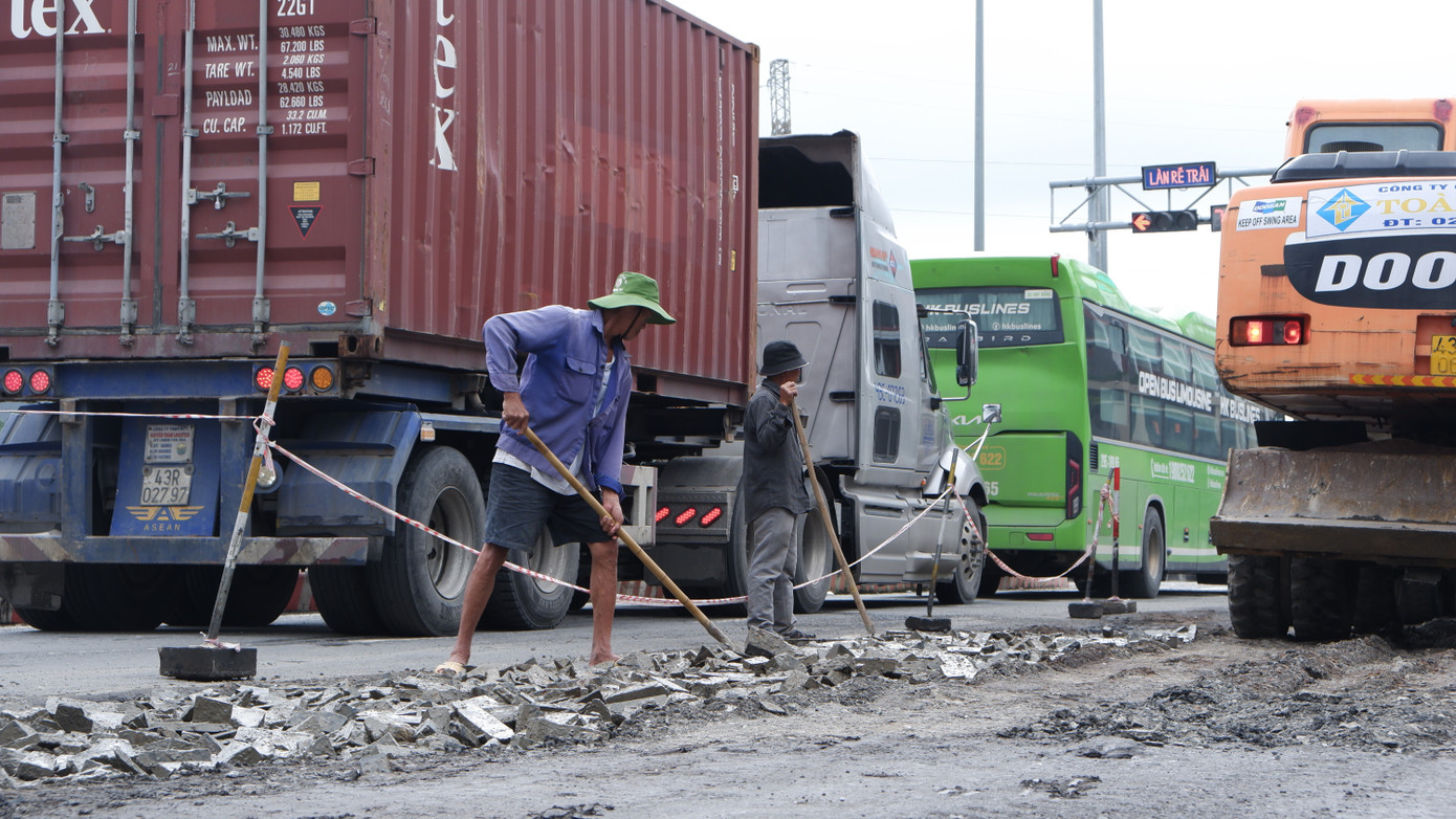 Công nhân thi công tại điểm hư hỏng nặng khu vực nút giao Ngô Quyền - Trần Thị Lý - Nguyễn Văn Thoại. Theo Phó giám đốc Sở Xây dựng, hiện tại chỉ mới khắc phục sửa chữa tạm thời, hư hỏng ở đâu khắc phục ở đó.