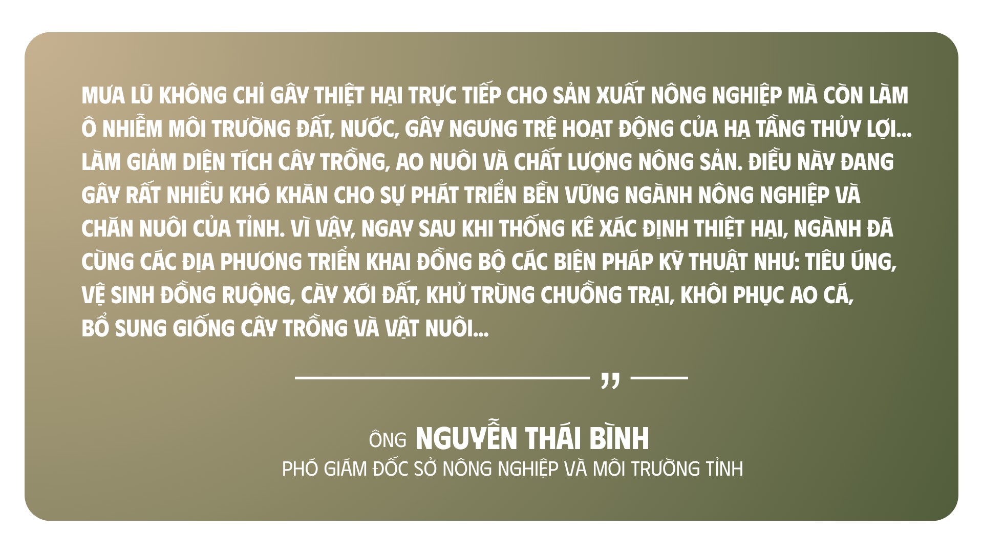 Công tác khắc phục hậu quả mưa lũ gây ra cho sản xuất nông nghiệp dù còn rất nhiều khó khăn, nhưng với sự chủ động vào cuộc của các cấp, các ngành trong tỉnh và chính quyền các địa phương, cùng sự nỗ lực của người dân những nơi lũ đi qua, chắc chắn những cánh đồng sẽ xanh trở lại, ngành chăn nuôi và thủy sản sẽ sớm được khôi phục sau thiên tai.