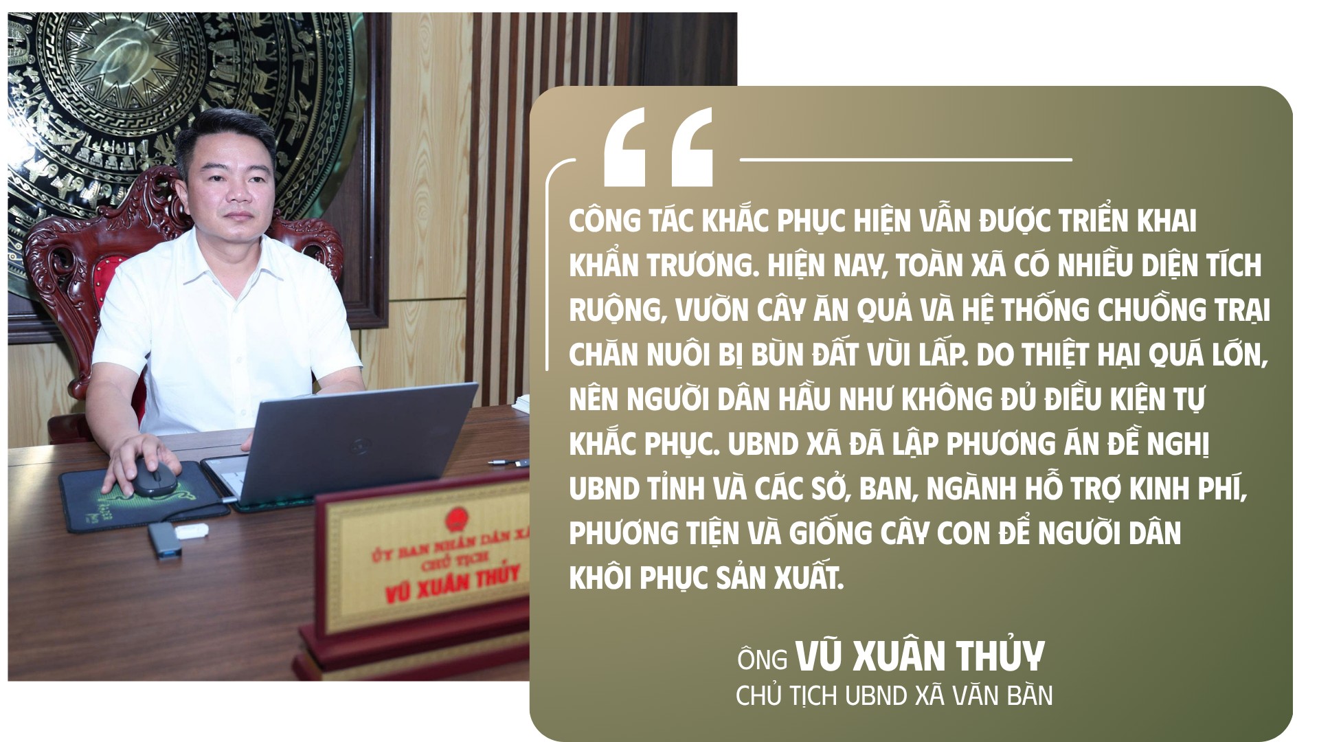 Xã Văn Bàn là một trong những địa phương chịu thiệt hại nặng nề nhất, với 263,3 ha cây nông nghiệp cùng hơn 4.400 con gia súc, gia cầm bị chết; 18,9 ha ao, hồ nuôi thủy sản bị tràn, vỡ bờ. Bên cạnh đó, toàn xã có 6 công trình thủy lợi, 2 đập đầu mối, 700 m mương bị cuốn trôi, sạt lở. Tổng thiệt hại ước tính trên 45 tỷ đồng.