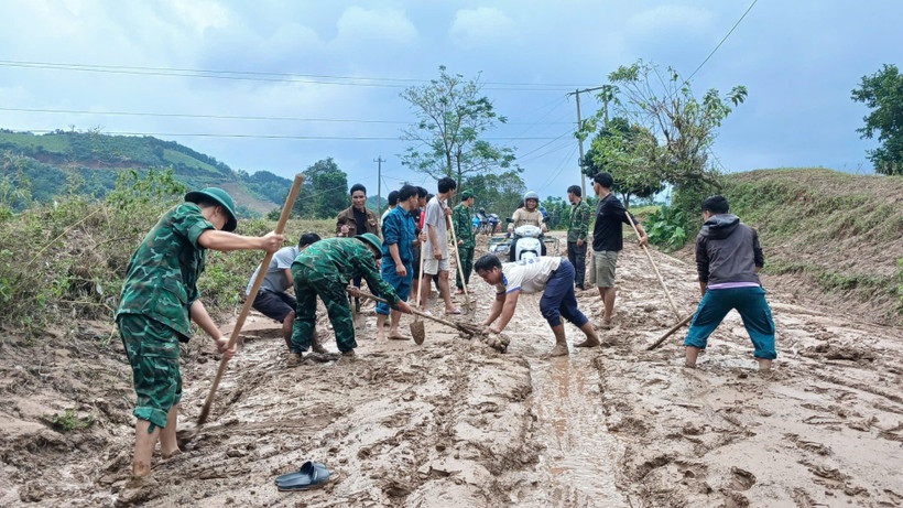 Đồn Biên phòng Ba Nang phối hợp với người dân dọn dẹp bùn đất tại các điểm sạt lở.