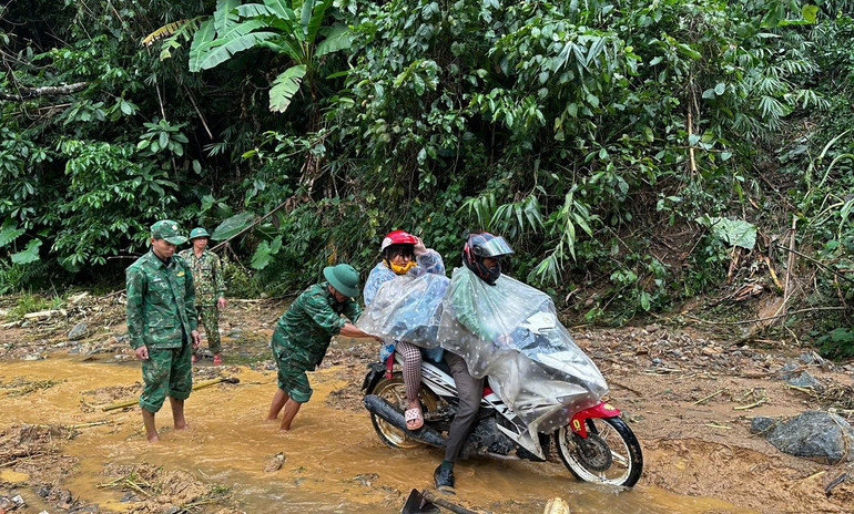 Lực lượng Biên phòng túc trực tại các điểm xung yếu, hỗ trợ người dân đi qua các điểm sạt lở.