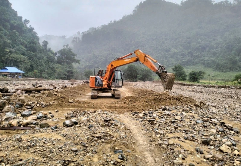 Đơn vị thi công khẩn trương khắc phục đường giao thông vào thôn Ruộng.