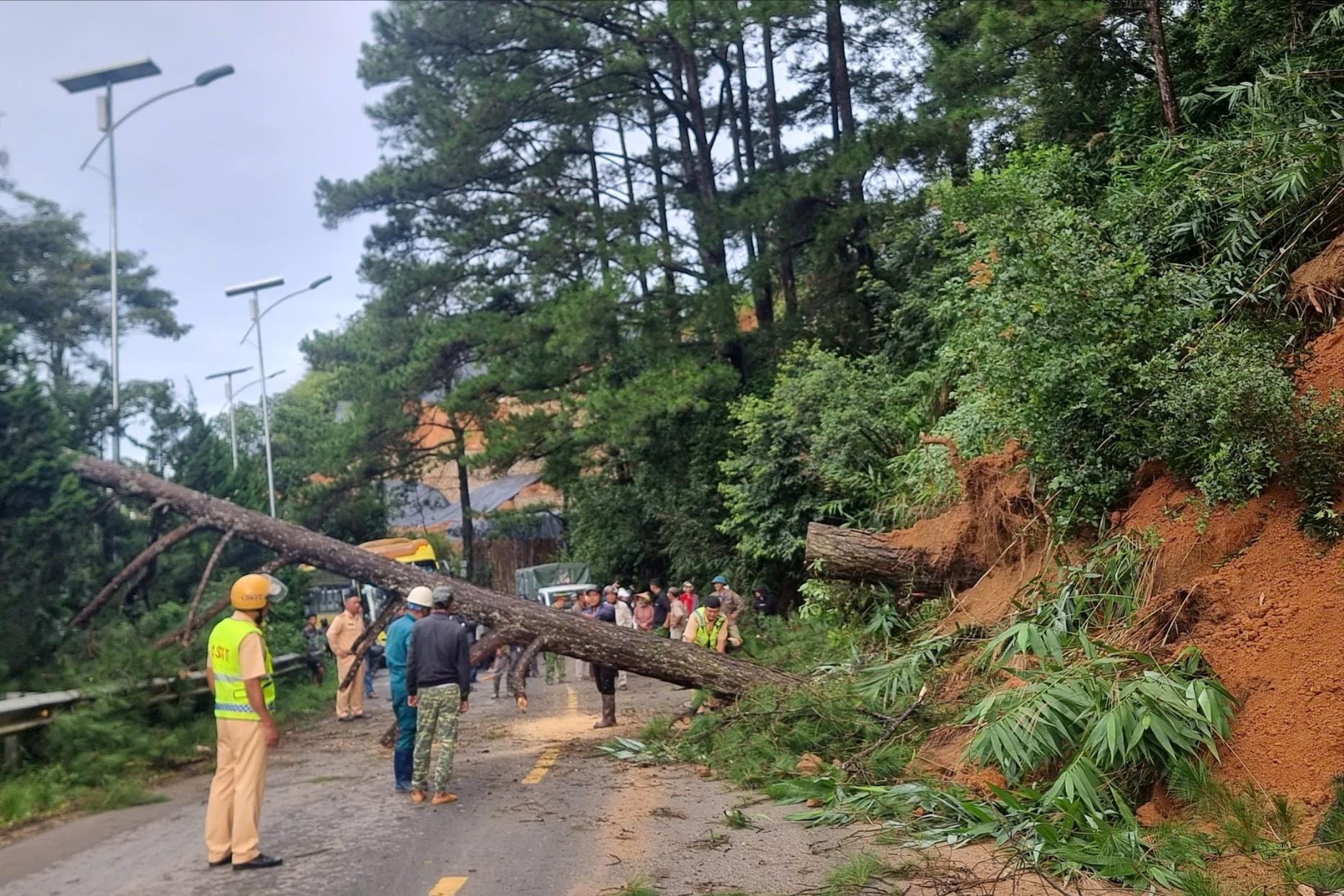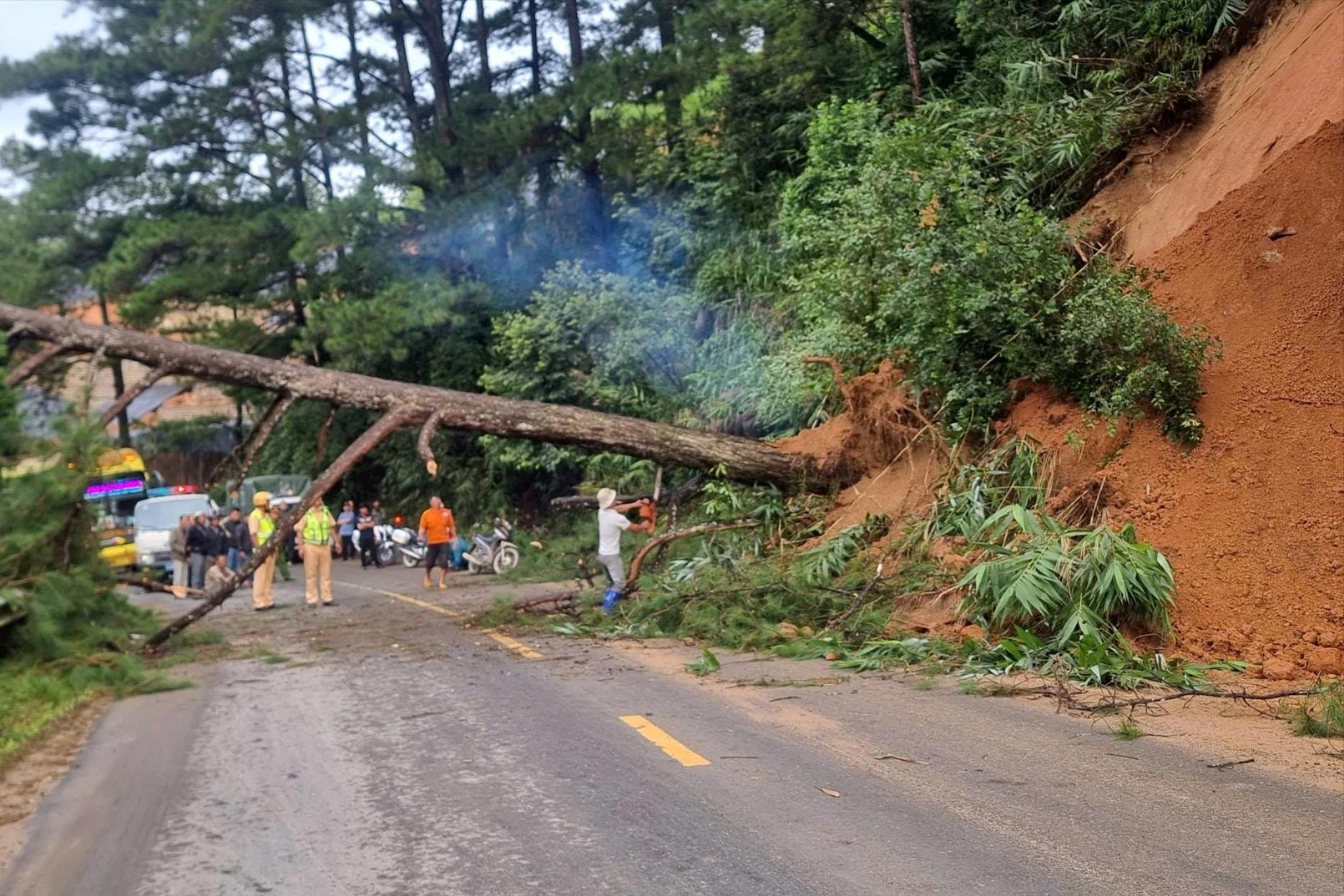 Cây thông ngã đổ chắn ngang Quốc lộ 27 qua D'ran