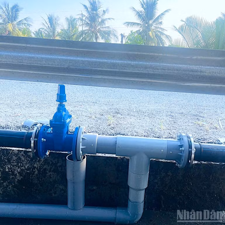 Ống nước được đấu nối, dẫn dọc theo cây cầu vùng giáp ranh tỉnh An Giang để dẫn nước ngọt về vùng "cuối nguồn" xã Biển Bạch, tỉnh Cà Mau.