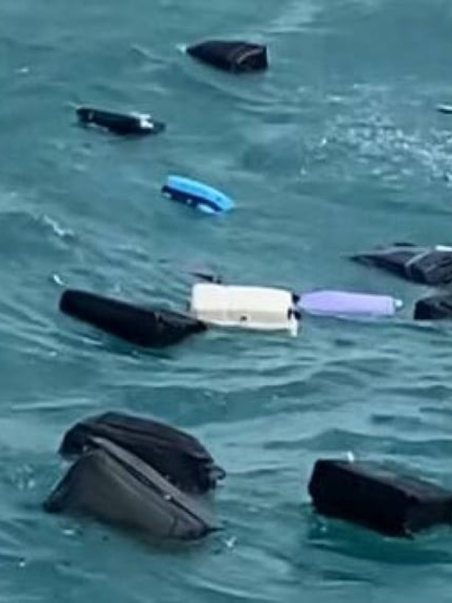 Hành lý trôi nổi trên biển sau sự cố sóng lớn hất văng vali xuống khỏi tàu. Ảnh: X.