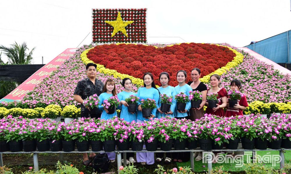 Du khách check-in với tiểu cảnh lá cờ và “trái tim làng hoa” tại Tổ sản xuất và cung ứng hoa kiểng khóm Tân An.