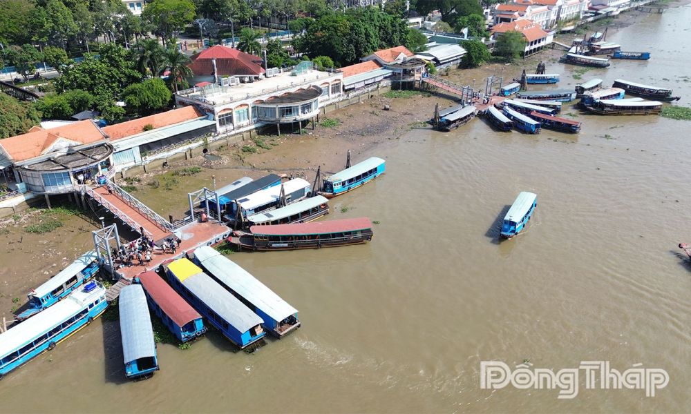 Bến tàu thủy du lịch Mỹ Tho nhộn nhịp ghe tàu và khách tham quan.