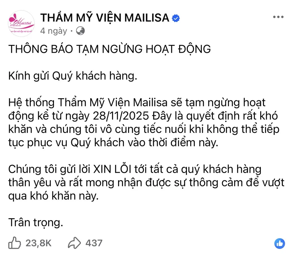 Chị Nguyễn Cao Linh (TP.HCM) cho biết chị đã mua gói trẻ hóa da trị giá hơn 20 triệu đồng và thanh toán toàn bộ từ tháng 9-2025. Chị mới thực hiện được vài buổi thì hệ thống Mailisa đột ngột đóng cửa.