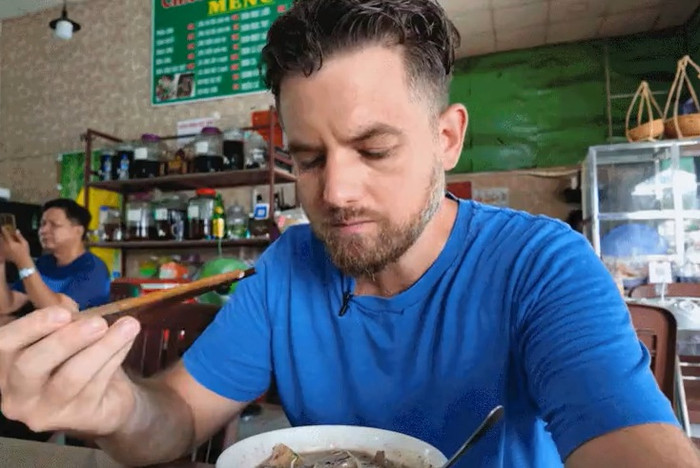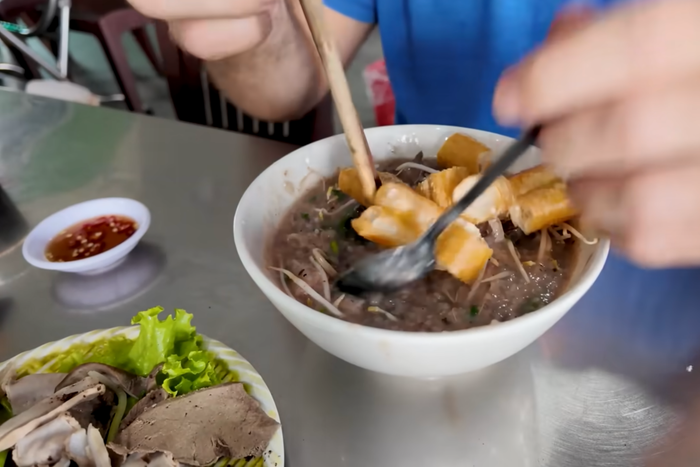 Thực khách nước ngoài thưởng thức món cháo lòng một cách thuần thục. (Ảnh chụp màn hình từ YouTube Chad Kubanoff)