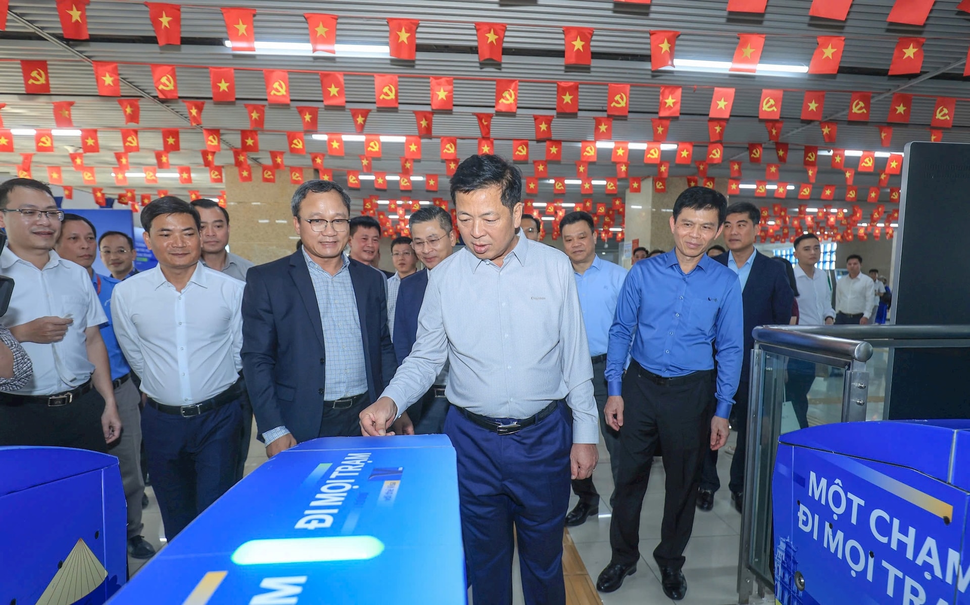Bộ trưởng Trần Hồng Minh trải nghiệm hệ thống thẻ vé điện tử của tuyến đường sắt đô thị 2A Cát Linh – Hà Đông. Ảnh: Tạ Hải