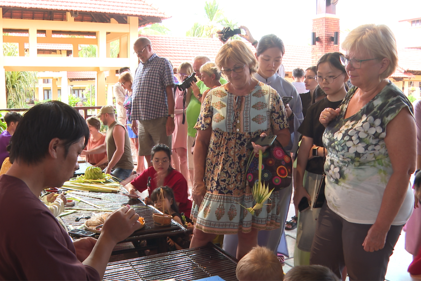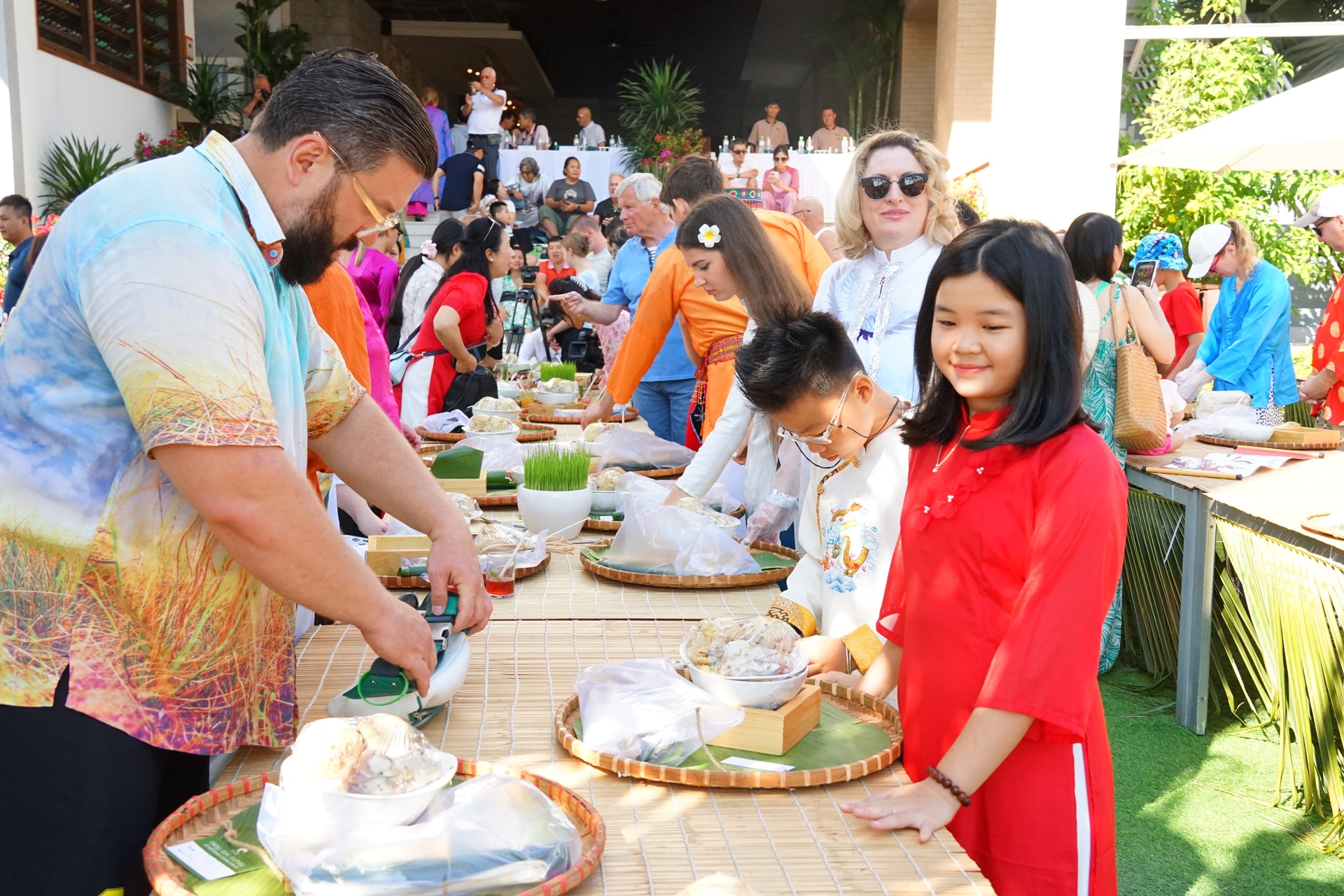 Trong đó, trải nghiệm gói bánh chưng - biểu tượng ẩm thực gắn liền với truyền thống dân tộc - thu hút đông đảo du khách. Tại các khu nghỉ dưỡng nhiều du khách châu Âu, châu Á lần đầu tự tay gói bánh, tìm hiểu ý nghĩa ngày Tết Việt.