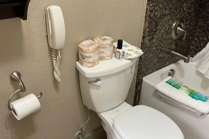Điện thoại trong nhà vệ sinh khách sạn. Ảnh: Reddit