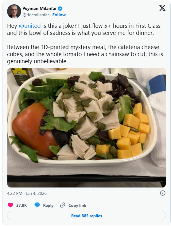 Chia sẻ bức ảnh, Milanfar viết: "Này @united, đây là trò đùa à? Sau hơn 5 giờ bay ở khoang hạng nhất, tôi nhận lại được bát salad đáng buồn như thế này à?". Bài đăng nhanh chóng lan truyền, thu hút hàng nghìn lượt thích, chia sẻ và bình luận.