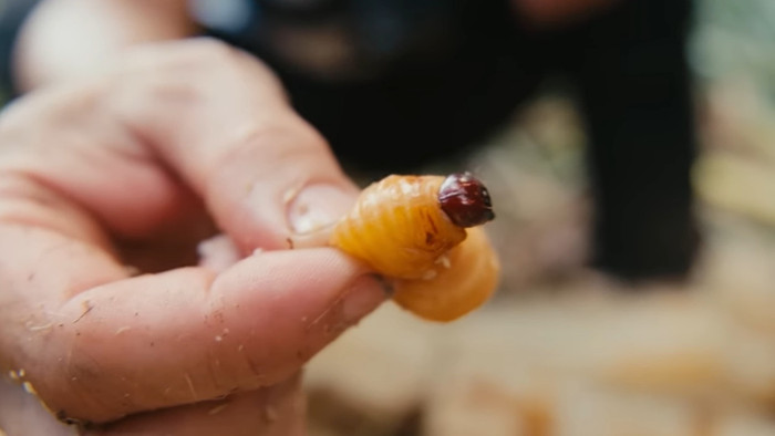 Du khách nước ngoài thích thú khi nhìn thấy con đuông dừa. (Ảnh chụp màn hình từ kênh YouTube Andrew Fraser)