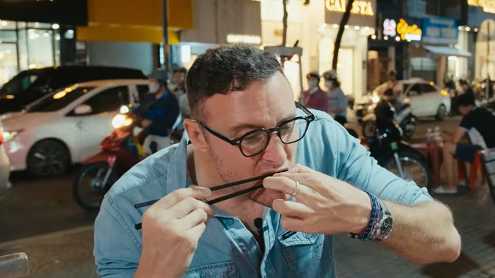 Anh còn thưởng thức món đuông dừa ngâm mắm ớt, vốn là đặc sản miền Tây. (Ảnh chụp màn hình từ kênh YouTube Andrew Fraser)