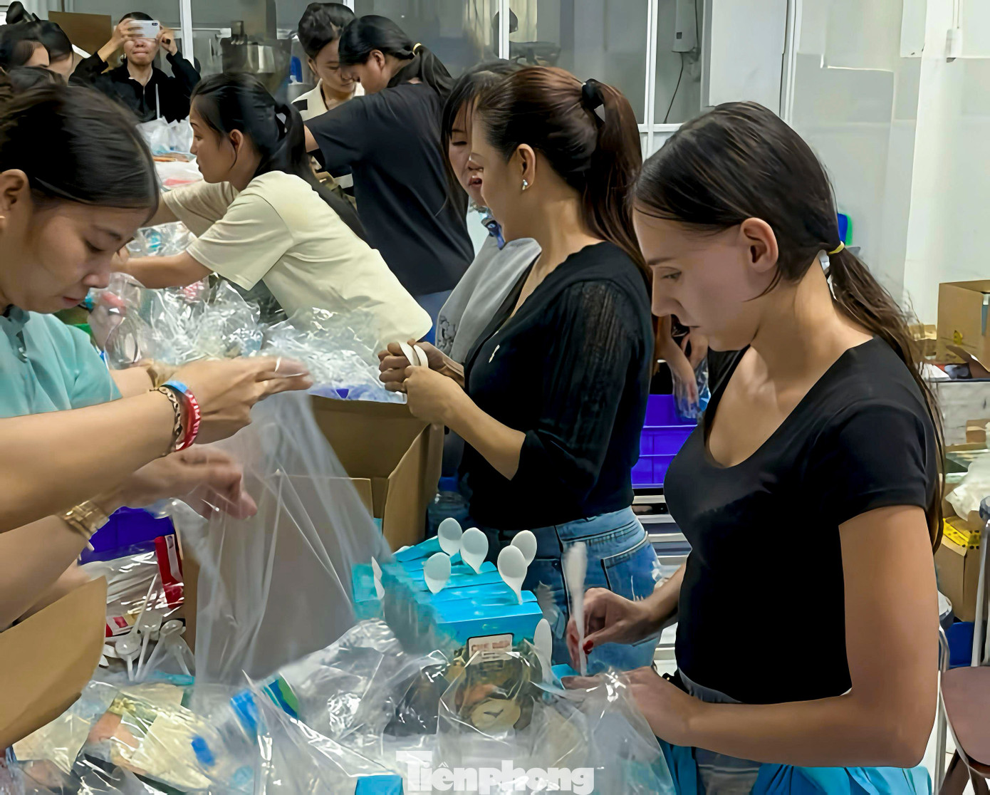 Nhiều du khách nước ngoài cũng tham gia nấu ăn, đóng gói và hỗ trợ cùng các đoàn thiện nguyện.