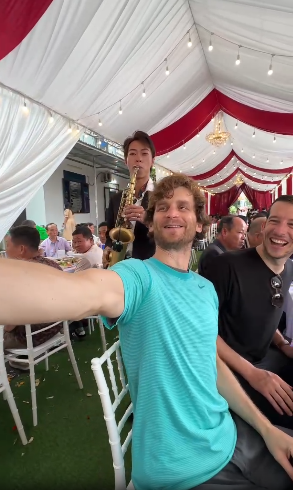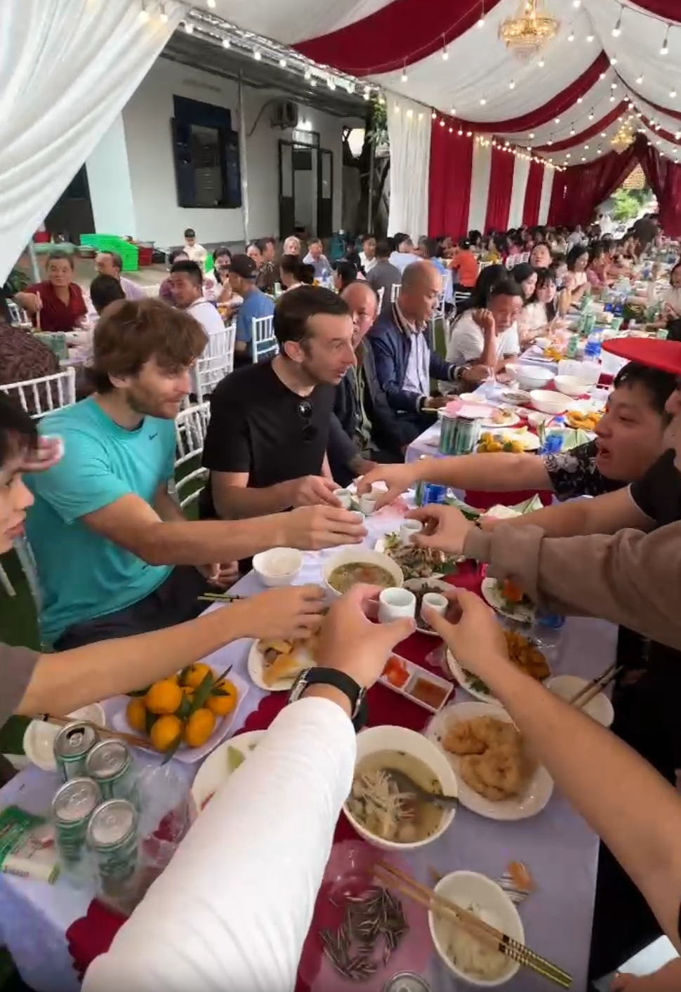 Trước đó, hai du khách nước ngoài đi lạc đường ở Ninh Bình, dừng lại hỏi thăm gần một đám cưới ven đường và được gia chủ mời luôn vào dùng bữa. Bất đồng ngôn ngữ được giải quyết bằng ứng dụng dịch trên điện thoại, còn cuộc vui diễn ra trong không khí thân thiện và cởi mở.