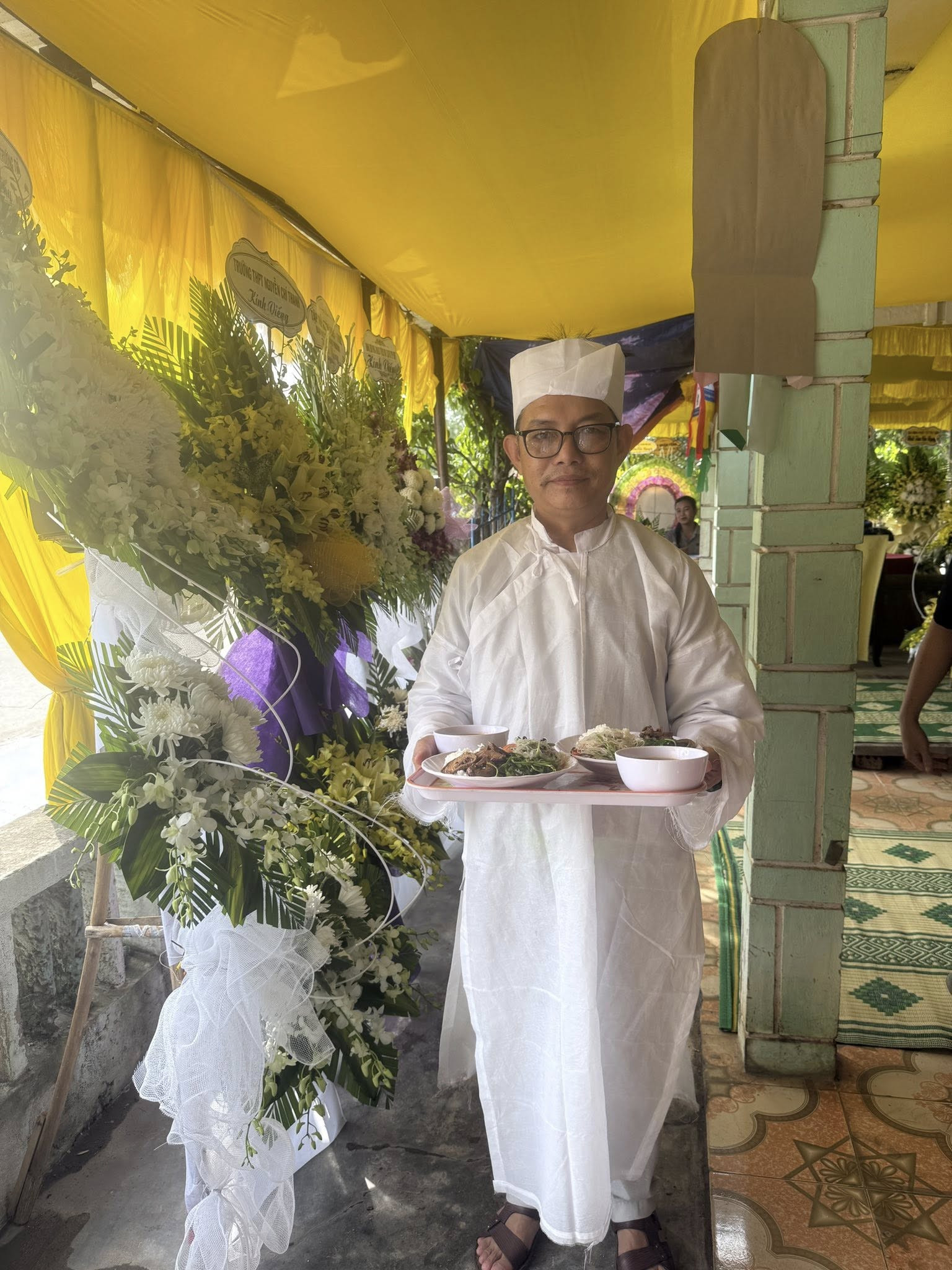 Anh Cửu cho hay, ở Huế, trong đám tang, người ta thường dọn cơm chay để giữ lòng thanh tịnh. Mâm cơm chay được chuẩn bị giản dị với vài món quen thuộc như rau dưa, đậu phụ, nấm và các món xào thanh đạm.