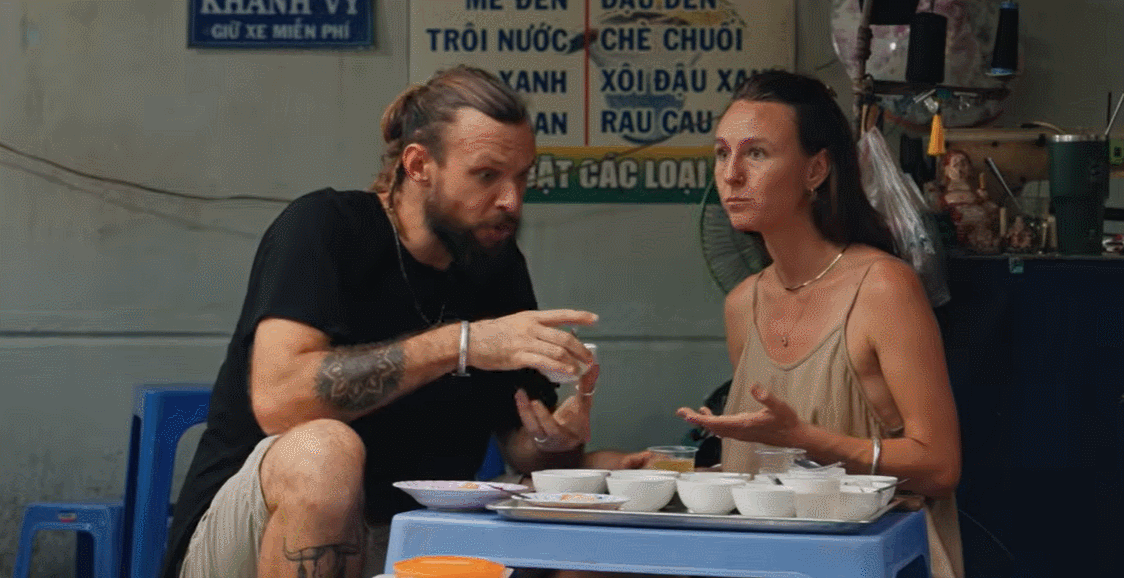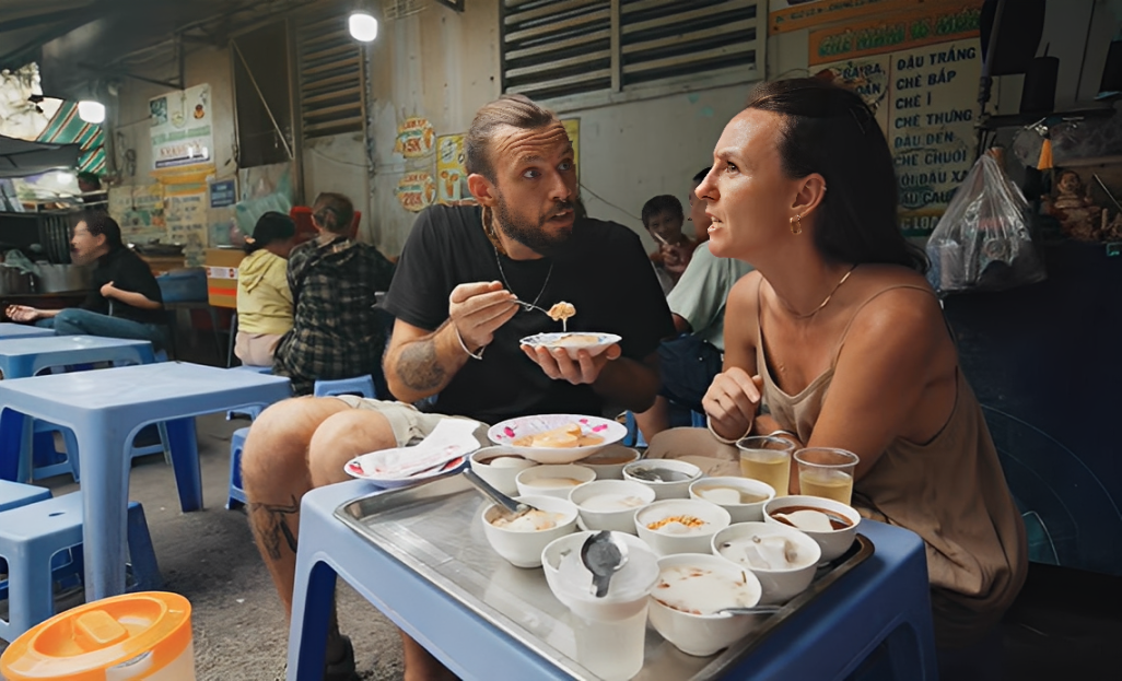 Vợ chồng Silke và Kieran thưởng thức món chè mâm ở vỉa hè TPHCM