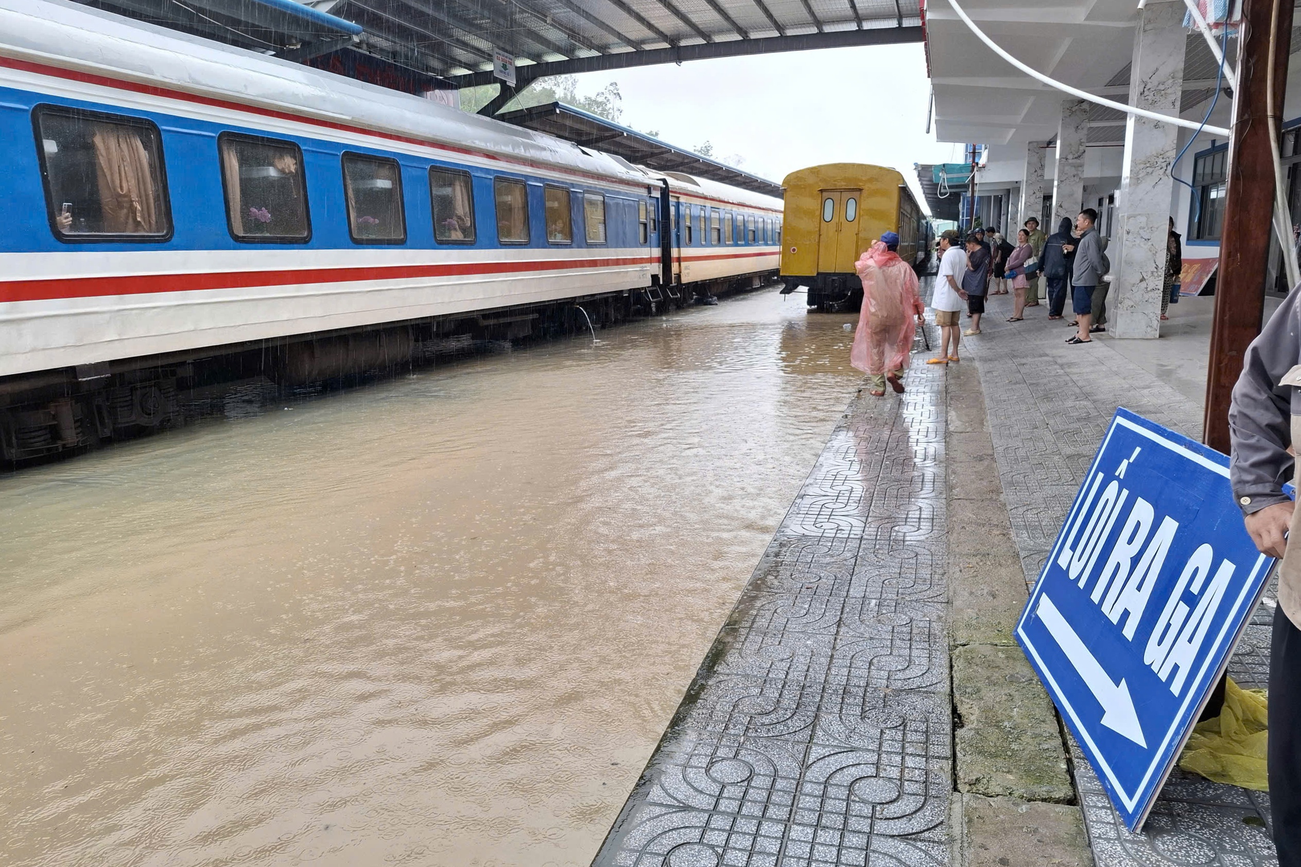 Ngành đường sắt phải dừng 10 chuyến tàu do mưa lớn tại các tỉnh Nam Trung Bộ. Ảnh: VNR.