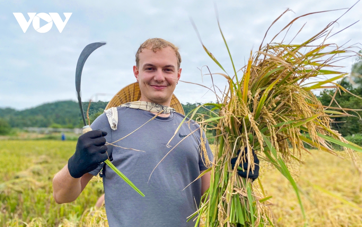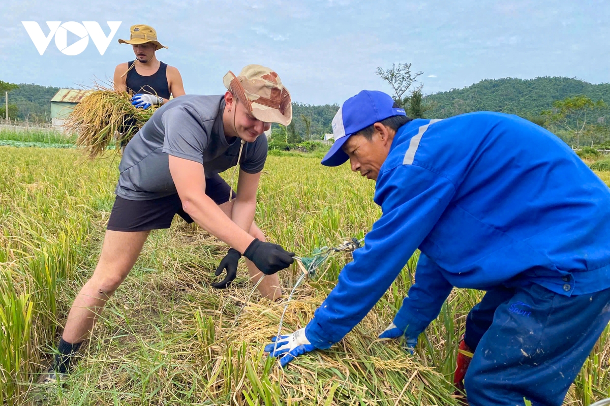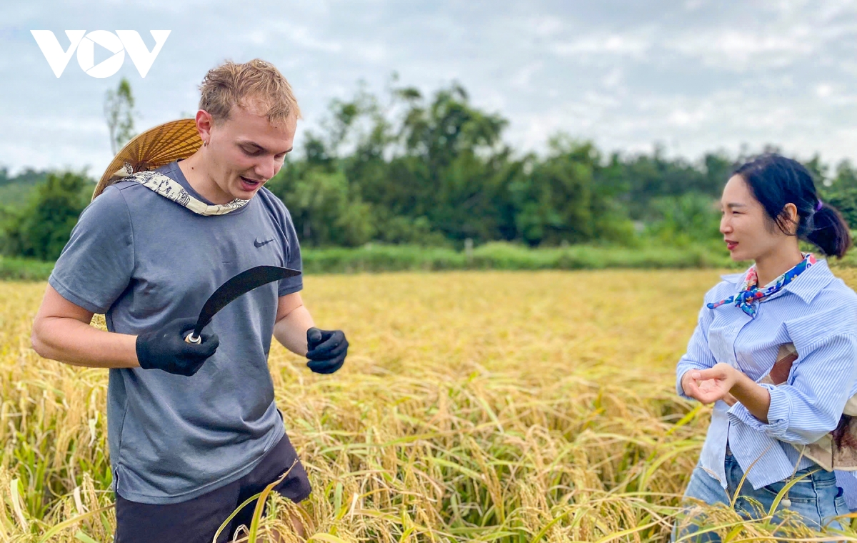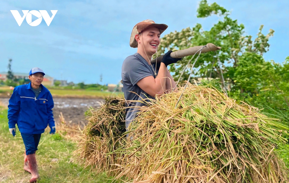 Bà Bùi Thị Phượng, người dân thôn Hải Tiến chia sẻ: “Thấy các bạn nước ngoài xuống ruộng gặt, tôi vừa ngạc nhiên vừa vui. Nhìn họ rất hào hứng khi được trải nghiệm làm nông dân”.