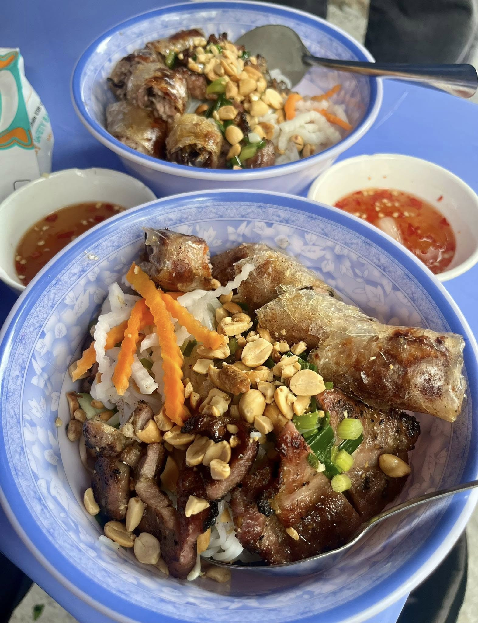 Suất bún thịt nướng chả giò mà hai vị khách Tây thưởng thức